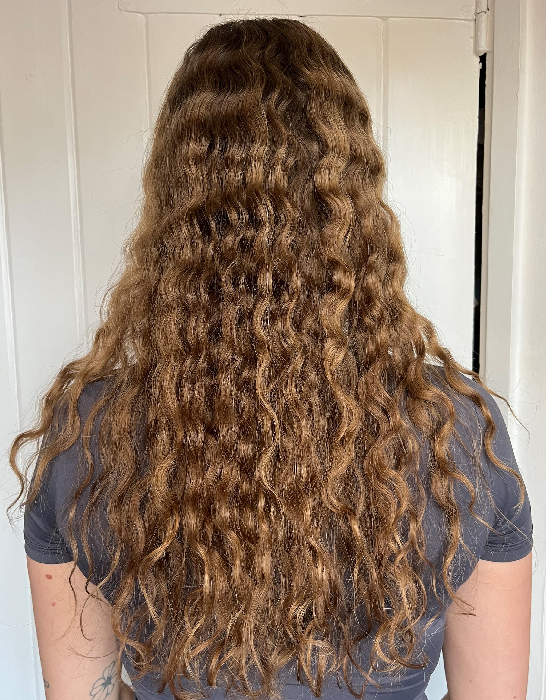 - Squeeze a coin-sized amount into your hands and massage through the mid-lengths and ends of your hair only. Leave for around 2-5 minutes