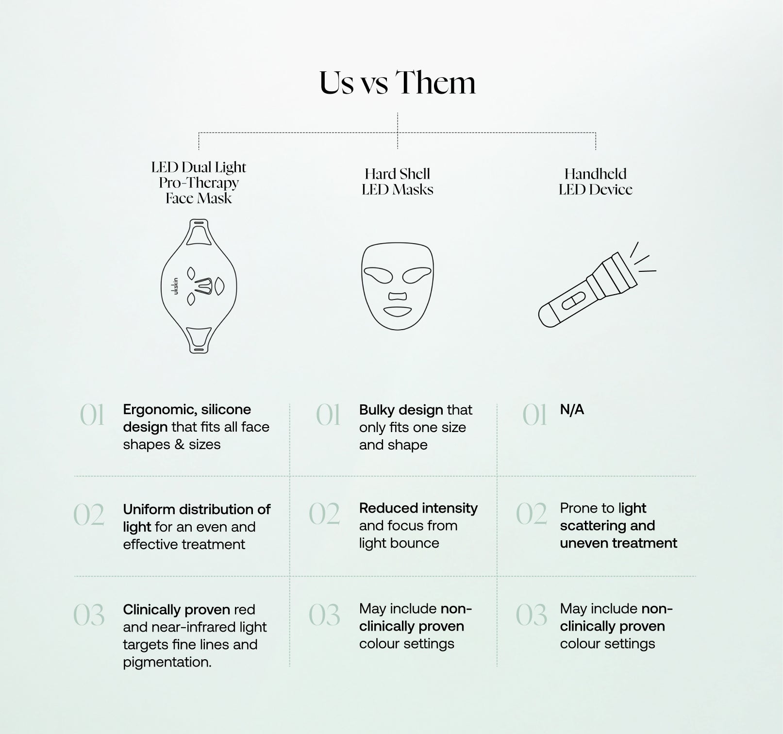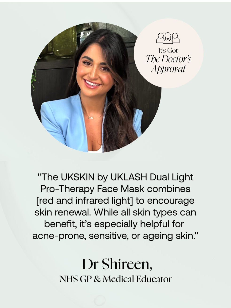 Our LED Dual Light Pro-Therapy Face Mask uses 112 medical-grade LEDs to achieve a firmer, brighter and more balanced skin tone. By partnering with LED skincare experts with over 25 years of experience, we have harnessed the power of Red light at 630nm (nanometers), and Near Infrared Light at 830nm - the clinically proven combination known to kickstart the cellular renewal process, with 96% of participants reporting visibly reduced fine lines, 98% noticing firmer skin, and 95% seeing a brighter-looking complexion.