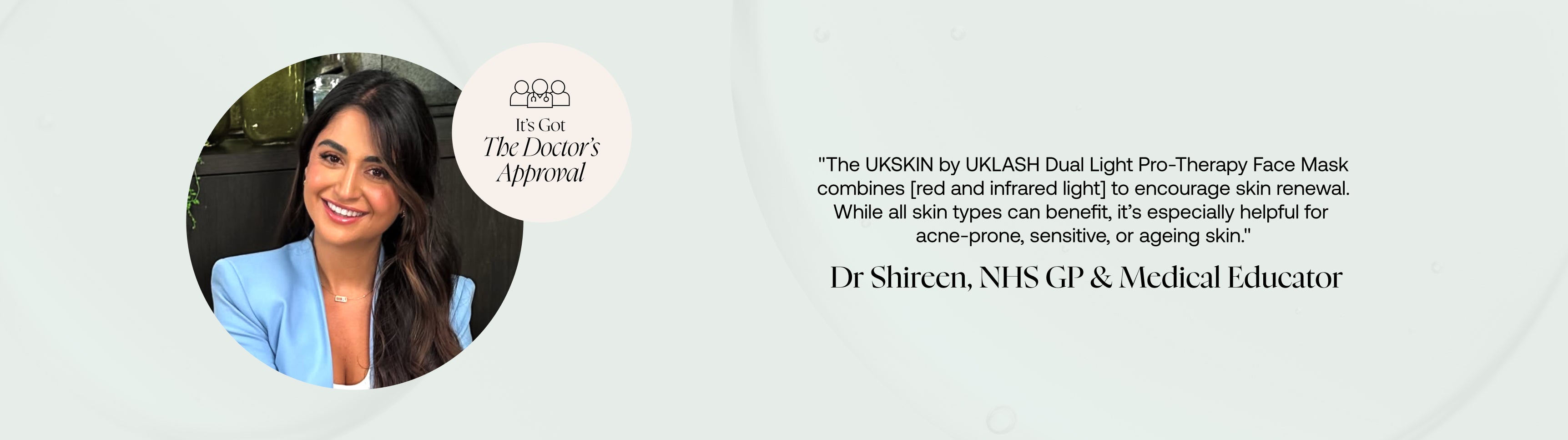 Our UKSKIN LED Dual Light Pro-Therapy Face Mask uses a combination of Red and Near Infrared Light to improve the appearance of fine lines and elasticity in the skin whilst balancing texture and overall skin tone.